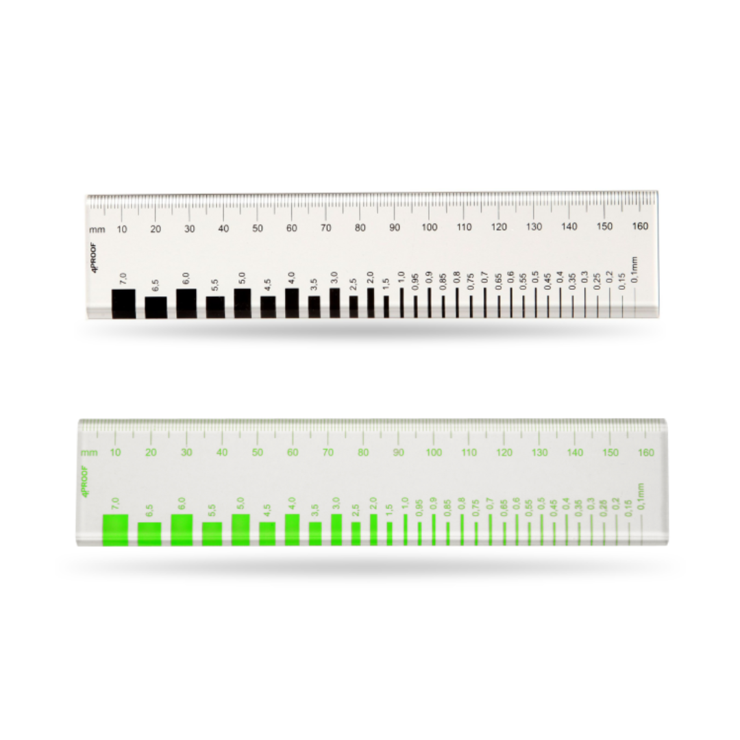 Die präzise aufgedruckten Rissbreitenindikatoren decken einen Messbereich von 0,1 mm bis 7,0 mm ab. Im feinen Bereich von 0,1 bis 1,0 mm erfolgt die Skalierung in 0,05 mm Abstufungen, während größere Risse von 1,0 bis 7,0 mm in 0,5 mm Schritten abgelesen werden können. So lassen sich sowohl feine Haarrisse als auch deutlich sichtbare Schäden sicher beurteilen.