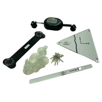 Mit Hilfe der mitgelieferten 2-Achsen-Schablone werden die P2E1-Platinen entsprechend den 3 Markierungen A, B und C befestigt. Beim ersten Mal werden die Messungen AB, AC und BC durchgeführt. Bei den Folgemessungen werden nur die Längen AB und AC gemessen (BC bleibt unverändert).